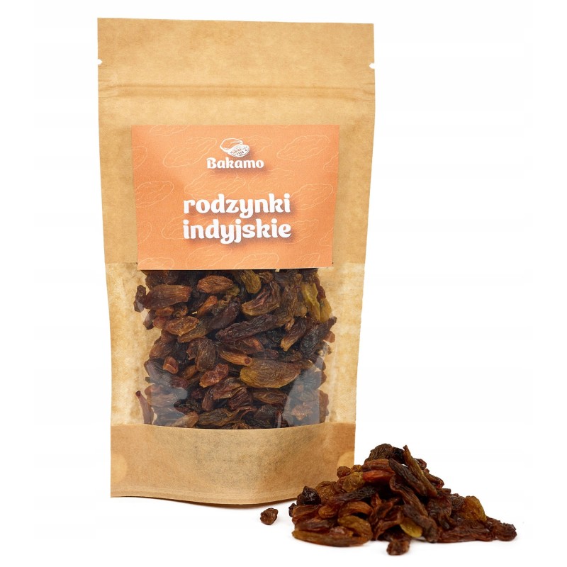Naturalne, słodkie i pełne energii RODZYNKI INDYJSKIE BAKAMO to pyszna i zdrowa przekąska dla całej rodziny. Powstają z dojrzałych, suszonych na słońcu winogron, dzięki czemu zachowują intensywny smak i bogactwo składników odżywczych. Idealne do deserów, wypieków, owsianki, a także jako zdrowa alternatywa dla słodyczy.