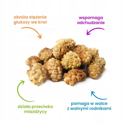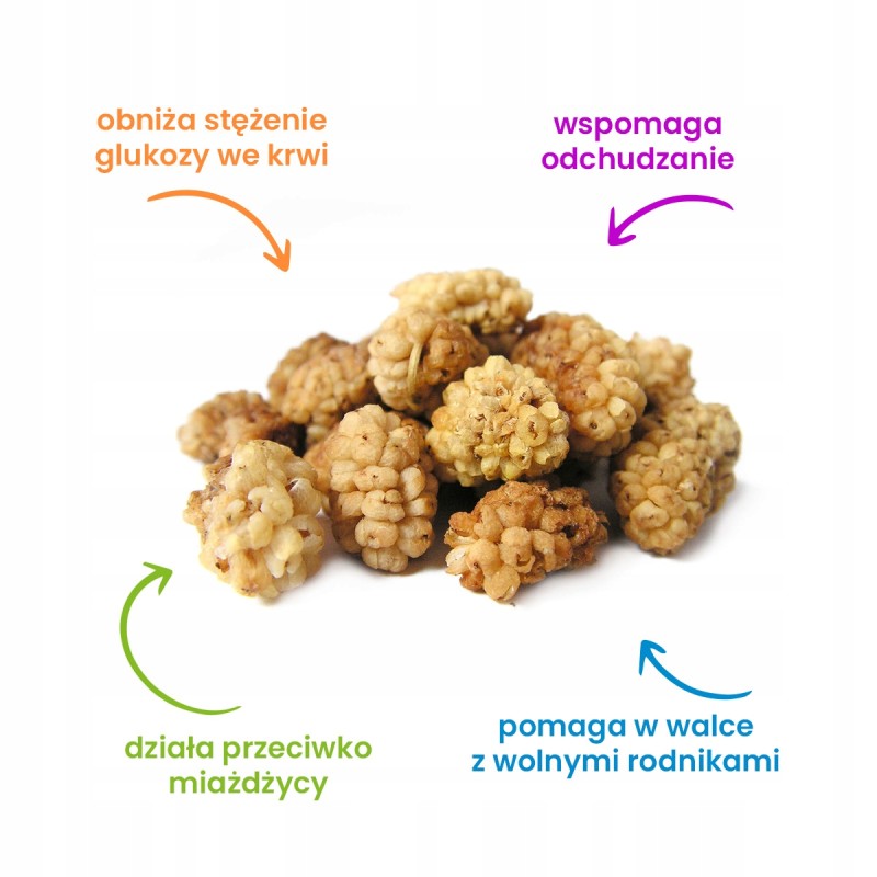 Morwa biała od wieków znana jest ze swoich właściwości wspomagających metabolizm, odporność i poziom cukru we krwi. Jej słodki smak sprawia, że to doskonała przekąska bez wyrzutów sumienia.