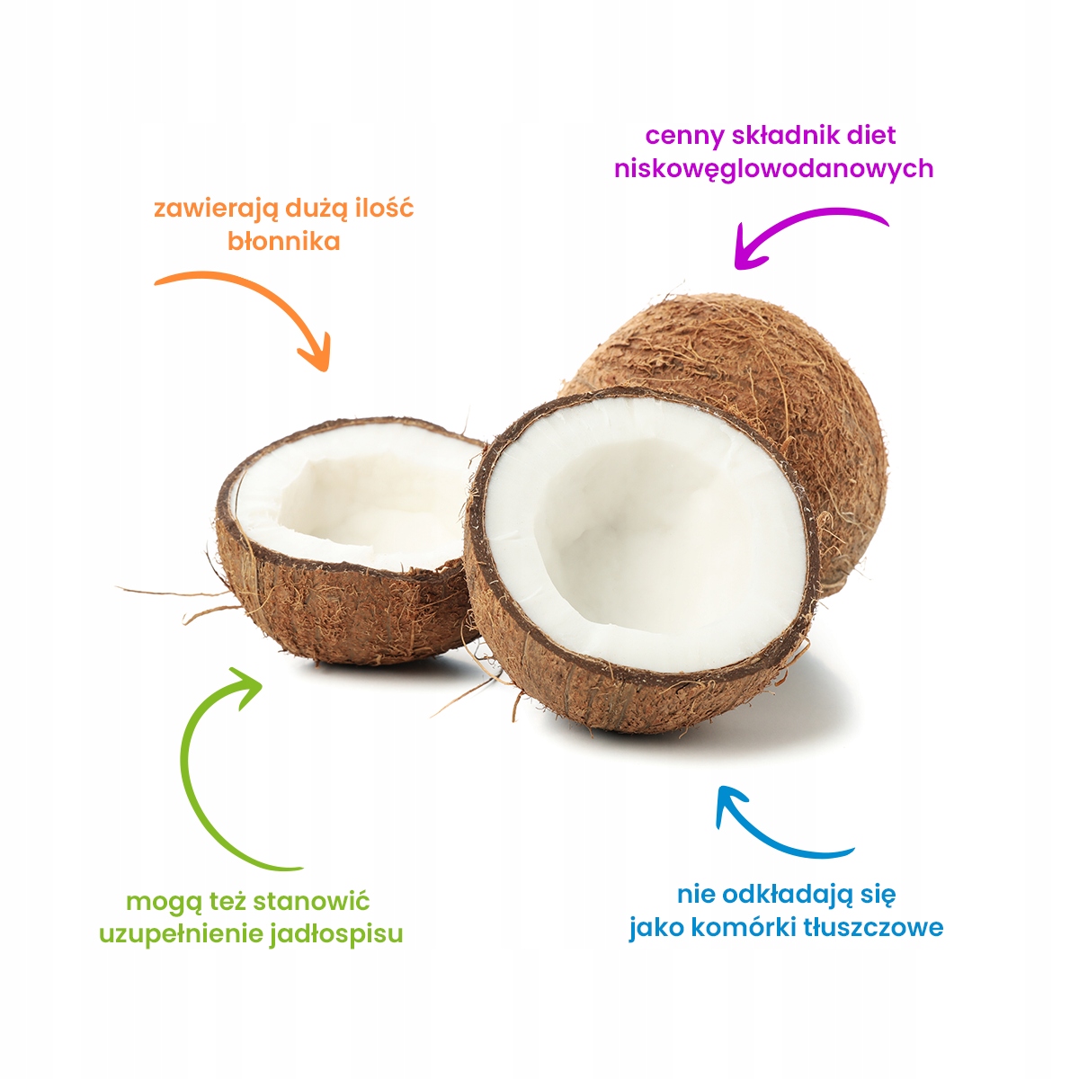 Wiórki kokosowe, czyli miąższ z kokosa (biała i mięsista masa, która znajduje się bezpośrednio pod twardą skorupą owocu), zawierają poza błonnikiem również potas, magnez, fosfor i kwas foliowy, a przede wszystkim cenne nasycone kwasy tłuszczowe. Są one metabolizowane w zupełnie inny sposób niż te pochodzenia zwierzęcego. Ponieważ ich cząsteczki są znacznie mniejsze, sam proces przebiega zdecydowanie szybciej i nie wymaga obecności enzymów, jakimi są lipaza i żółć. Ich zaletą jest przede wszystkim to, że nie odkładają się jako komórki tłuszczowe, ale są szybko wykorzystywanym źródłem energii dla organizmu.